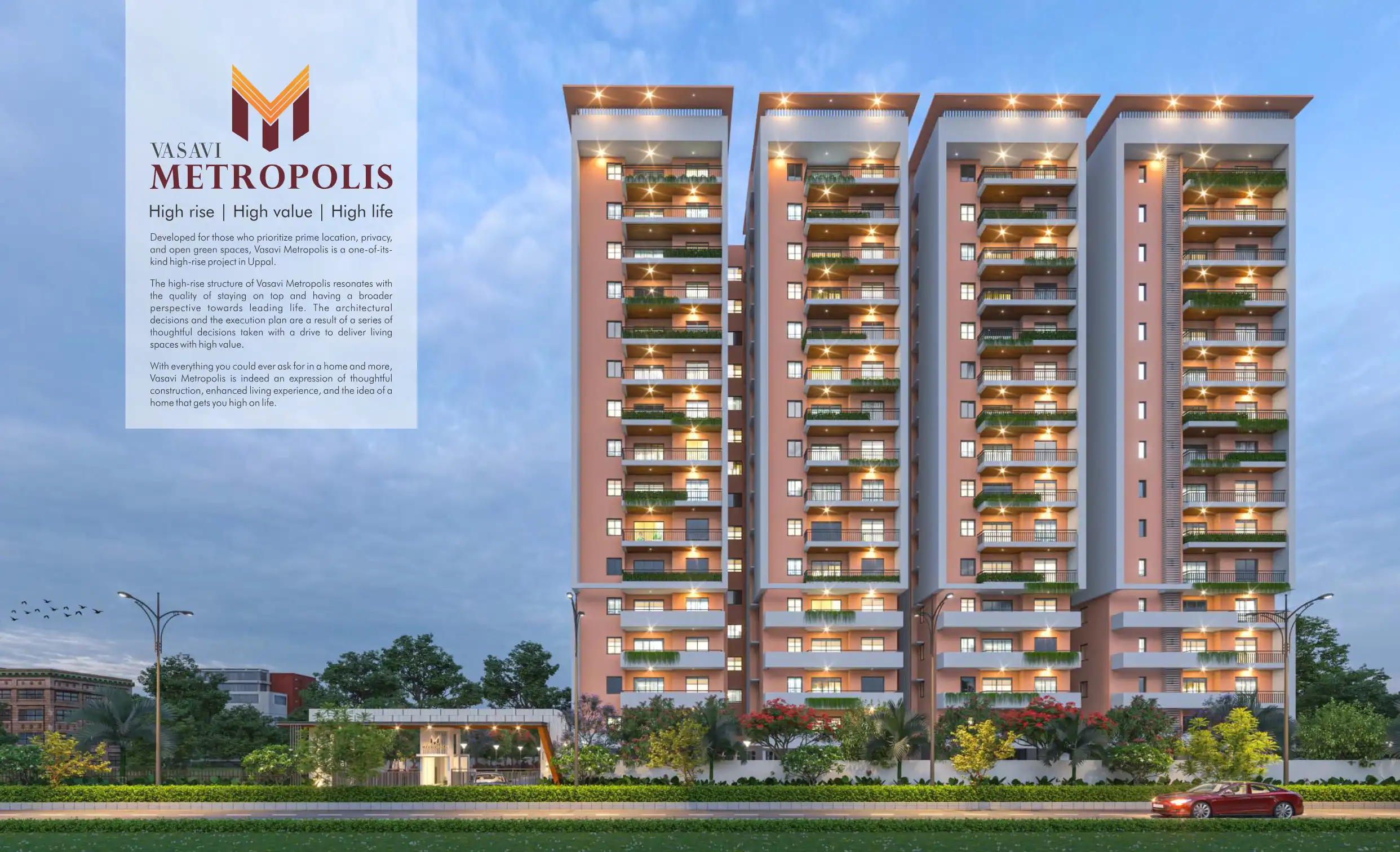 Vasavi Metropolis is a one-of-its-kind high-rise project in Uppal. Developed for those who prioritize prime location, privacy, and open green spaces.
