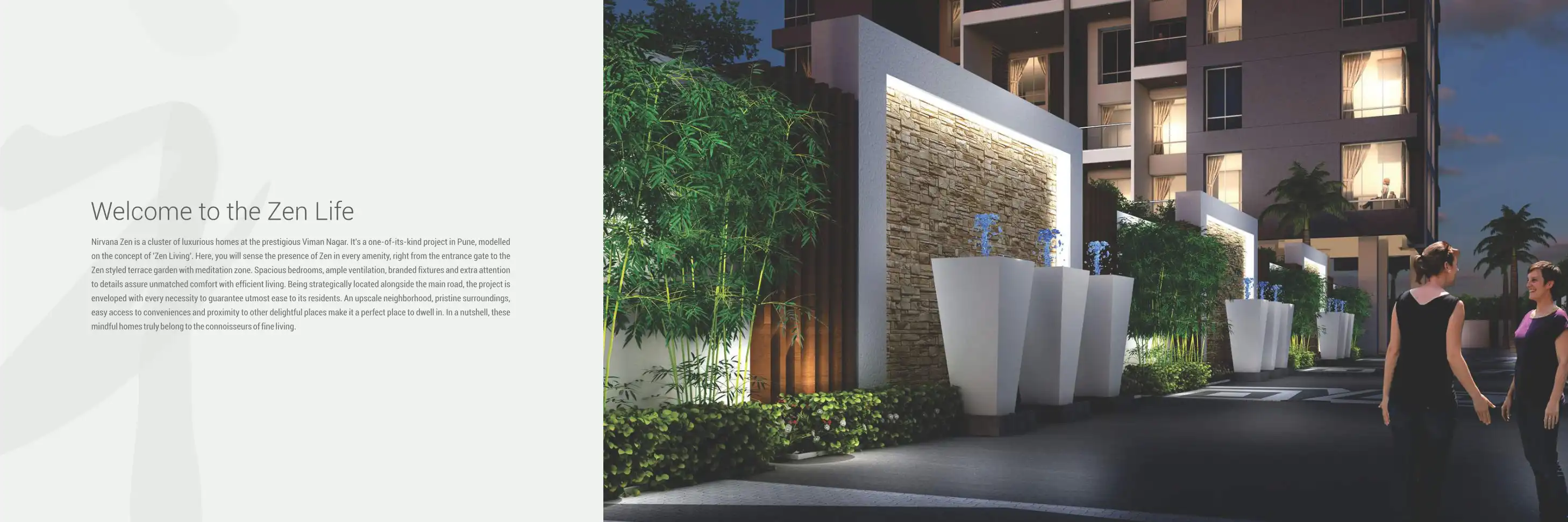 Nirvana Zen is a cluster of luxurious homes at the prestigious Viman Nagar. It's a one-of-its-kind project in Pune, modelled on the concept of 'Zen Living'. Here, you will sense the presence of Zen in every amenity, right from the entrance gate to th...