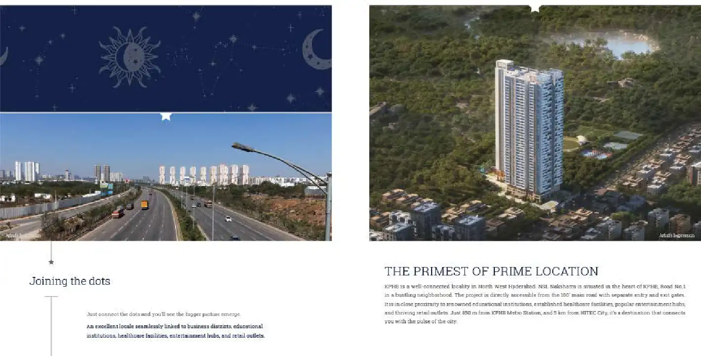 NSL Nakshatra is an ultra-premium tower residency in the prime location of KFHB, abutting 875 acres of lush green lung space, surrounded by well-matured social infrastructure. This one-of-its-kind Ground Floor +40-Storey highrise takes aspirations sk...