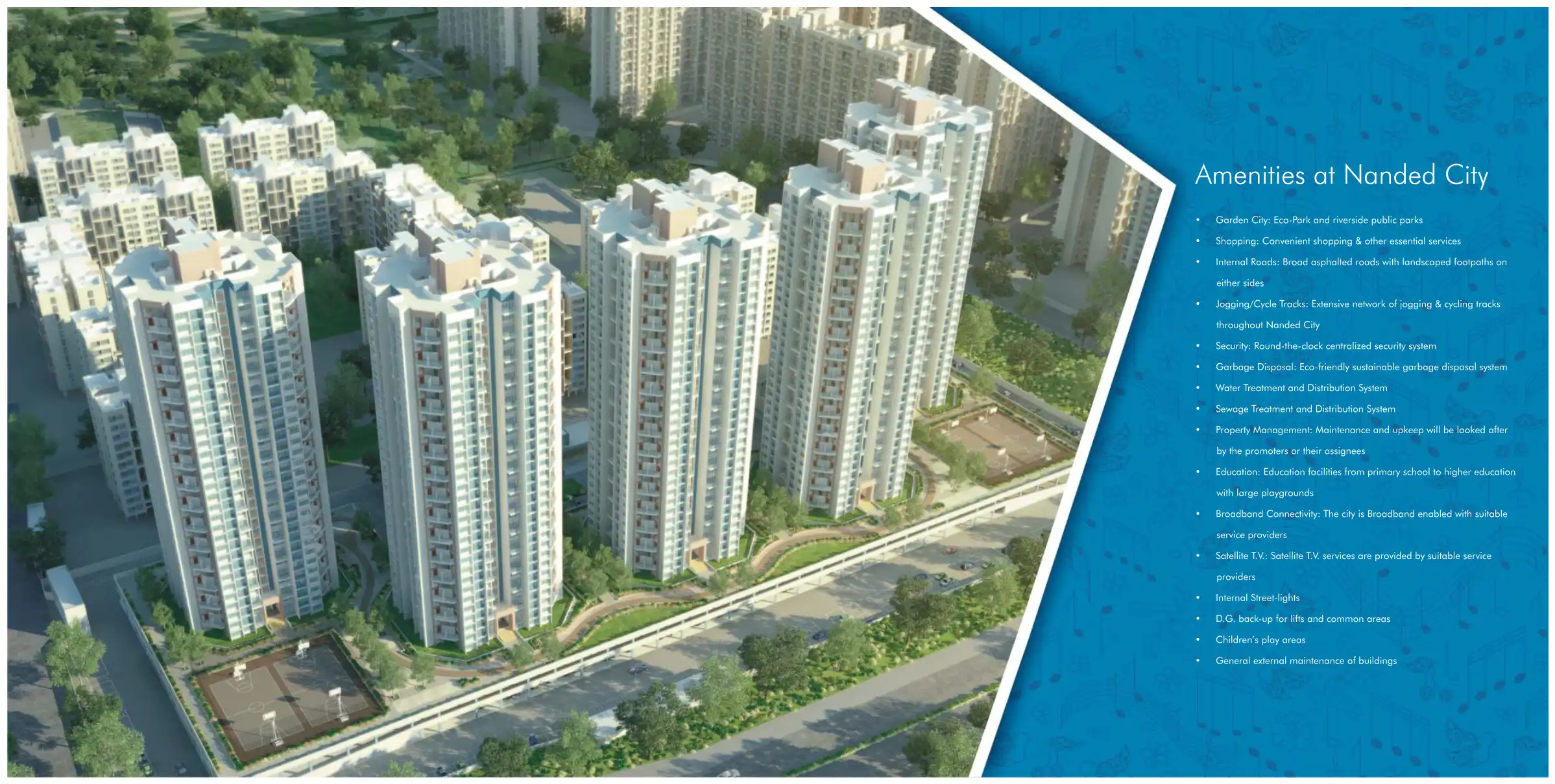 Nanded City provides a modern, self-sufficient lifestyle with a harmonious blend of residential, commercial, and recreational facilities. Residents benefit from extensive green spaces, reputable educational institutions such as Vidya Pratishthan's Nanded City Public School, comprehensive healthcare services, and convenient shopping options like Patanjali Mega Store.