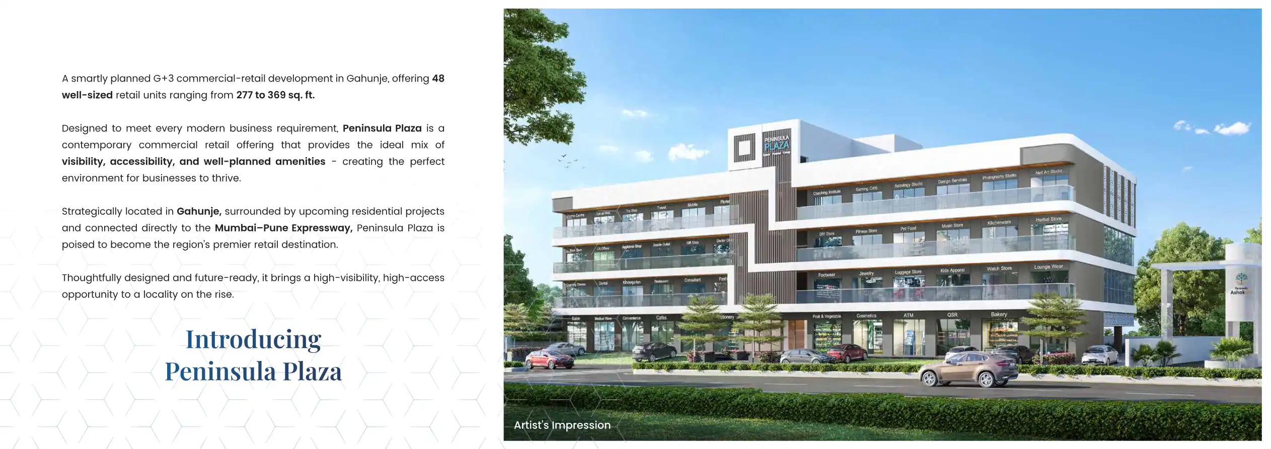 A smartly planned G+3 commercial-retail development in Gahunje, offering 48 well-sized retail units ranging from 277 to 369 sq. ft.