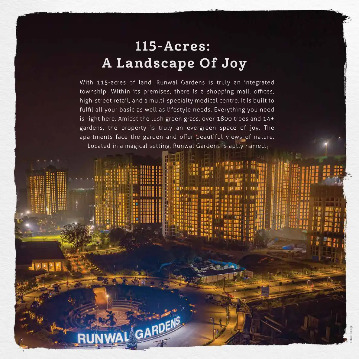 Runwal Gardens is truly an integrated township with basic and lifestyle needs with shopping mall, offices, high-street retail and a multi-specialty medical centre. Amidst the lush green grass, over 1800 trees and 14+ gardens, the property is truly an...