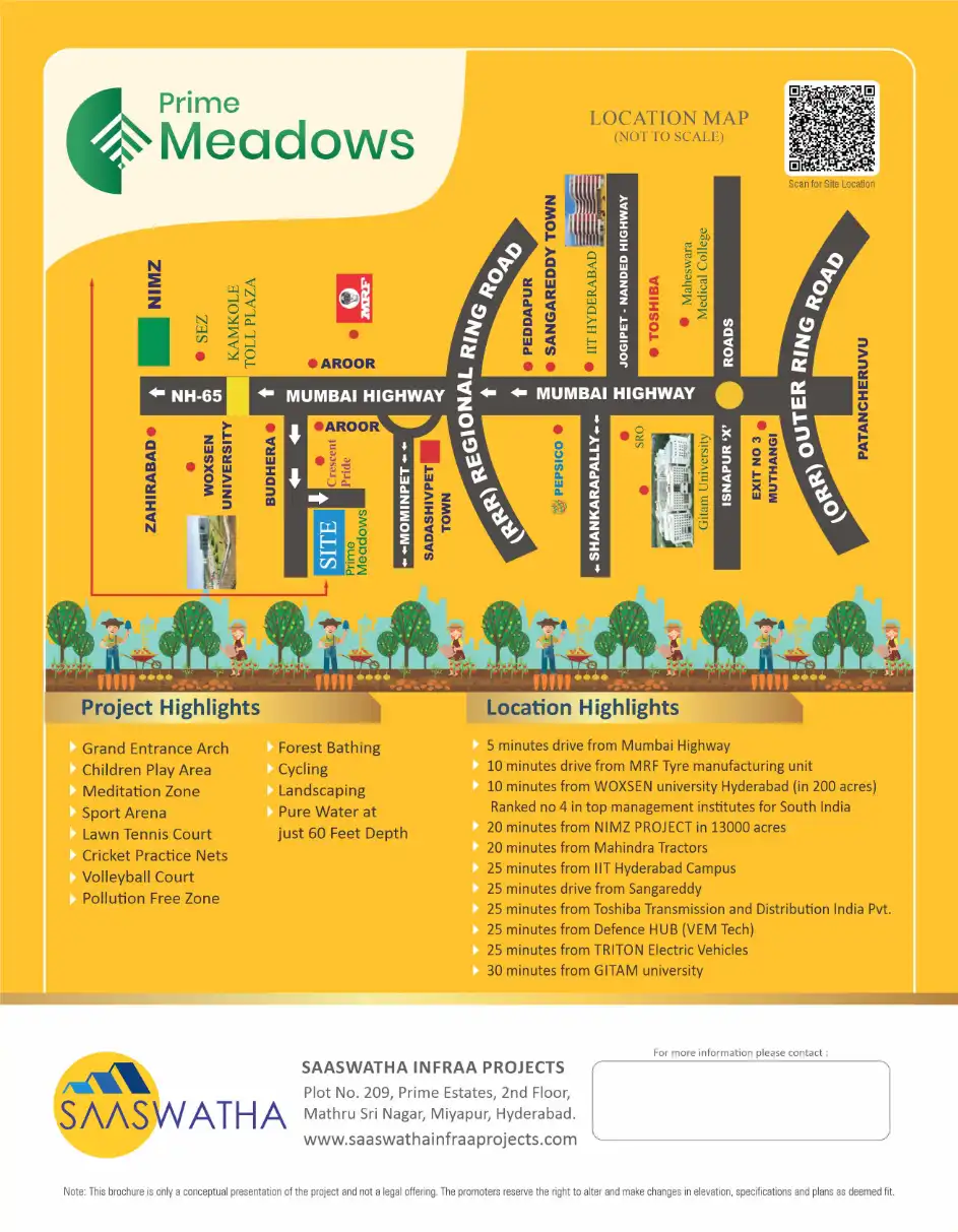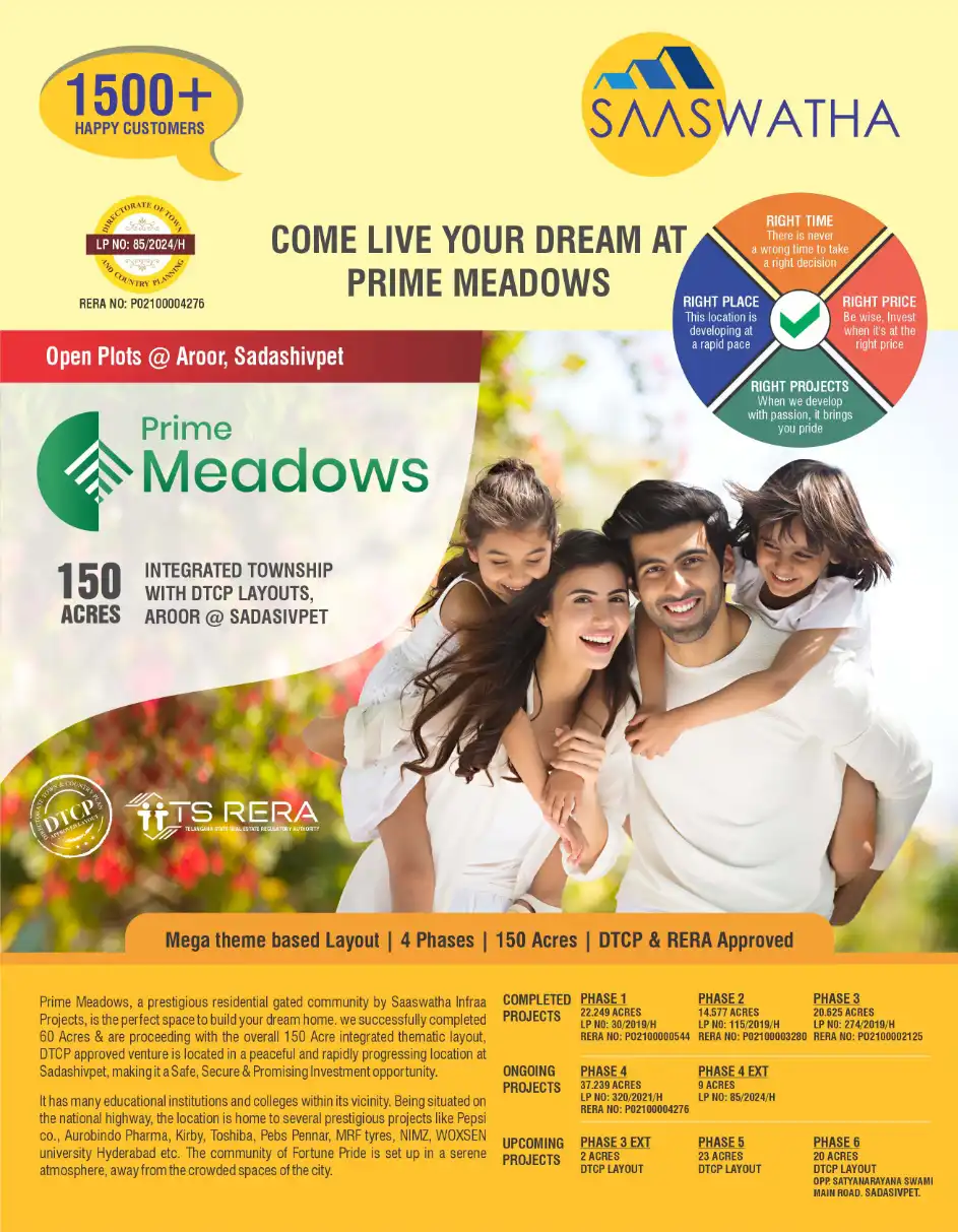 Prime Meadows, a prestigious residential gated community by Saaswatha Infraa Projects, is the perfect space to build your dream home. we successfully completed 60 Acres & are proceeding with the overall 150 Acre integrated thematic layout, DTCP appro...