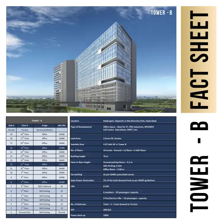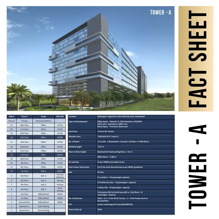 Multi storied (21 levels) Commercial Complex including Retail, Office and IT Space at Raidurgam, Gachibowli, Opp. Bio-diversity Park Hyderabad, with an accolade of Grade 'A' building duly approved by RERA