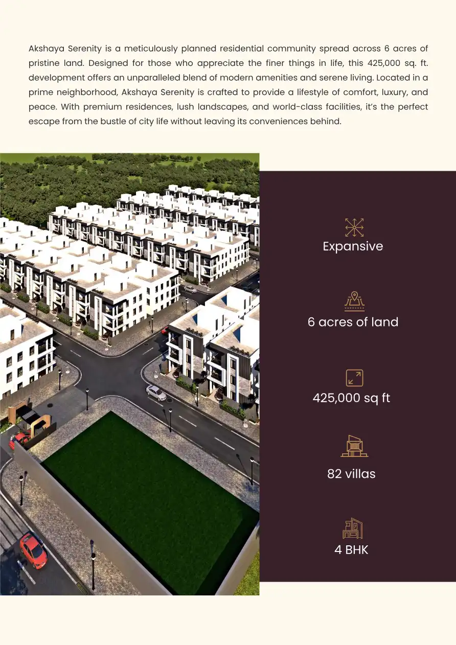 Akshaya Serenity is a meticulously planned residential community spread across 6 acres of pristine land. Designed for those who appreciate the finer things in life, this 425,000 sq. ft. development offers an unparalleled blend of modern amenities and...