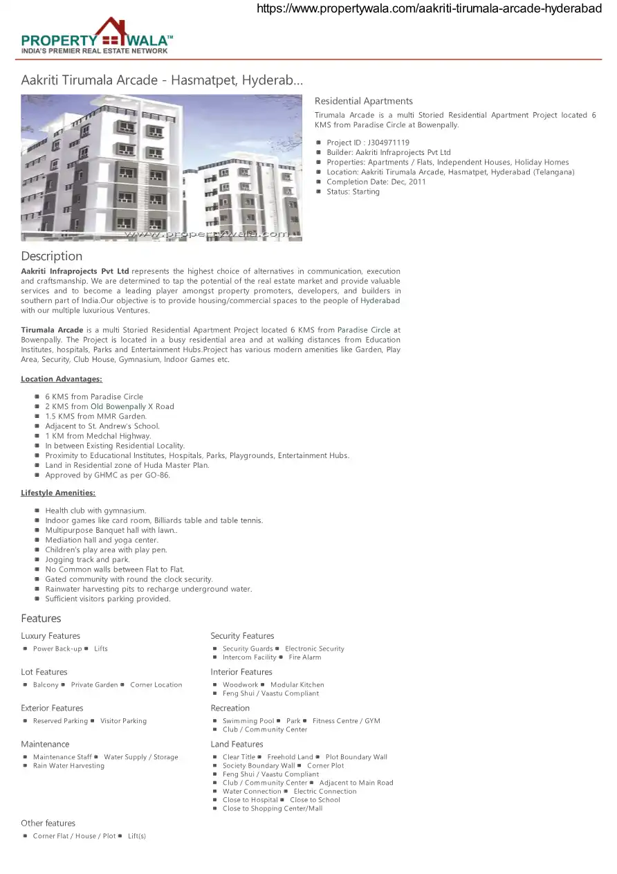 Tirumala Arcade is a multi Storied Residential Apartment Project located 6 KMS from Paradise Circle at Bowenpally. The Project is located in a busy residential area and at walking distances from Education Institutes, hospitals, Parks and Entertainmen...