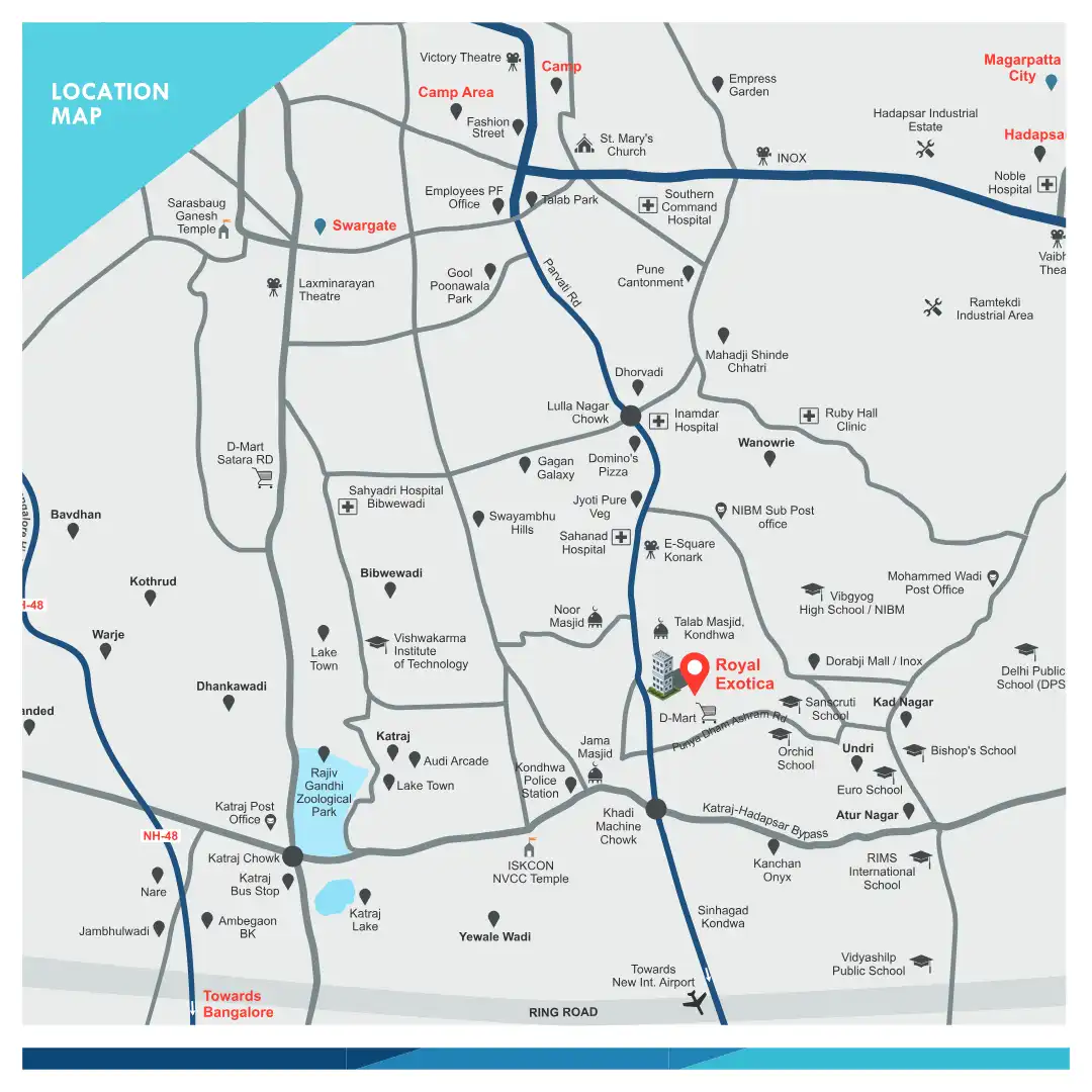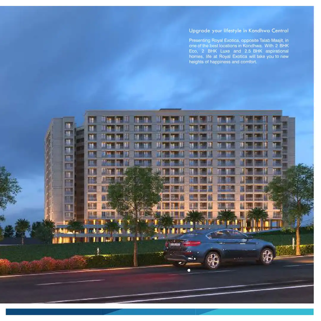 Presenting Royal Exotica, opposite Talab Masjit, in one of the best locations in Kondhwa. With 2 BHK Eco, 2 BHK Luxe and 2.5 BHK aspirational homes, life at Royal Exotica will take you to new heights of happiness and comfort.