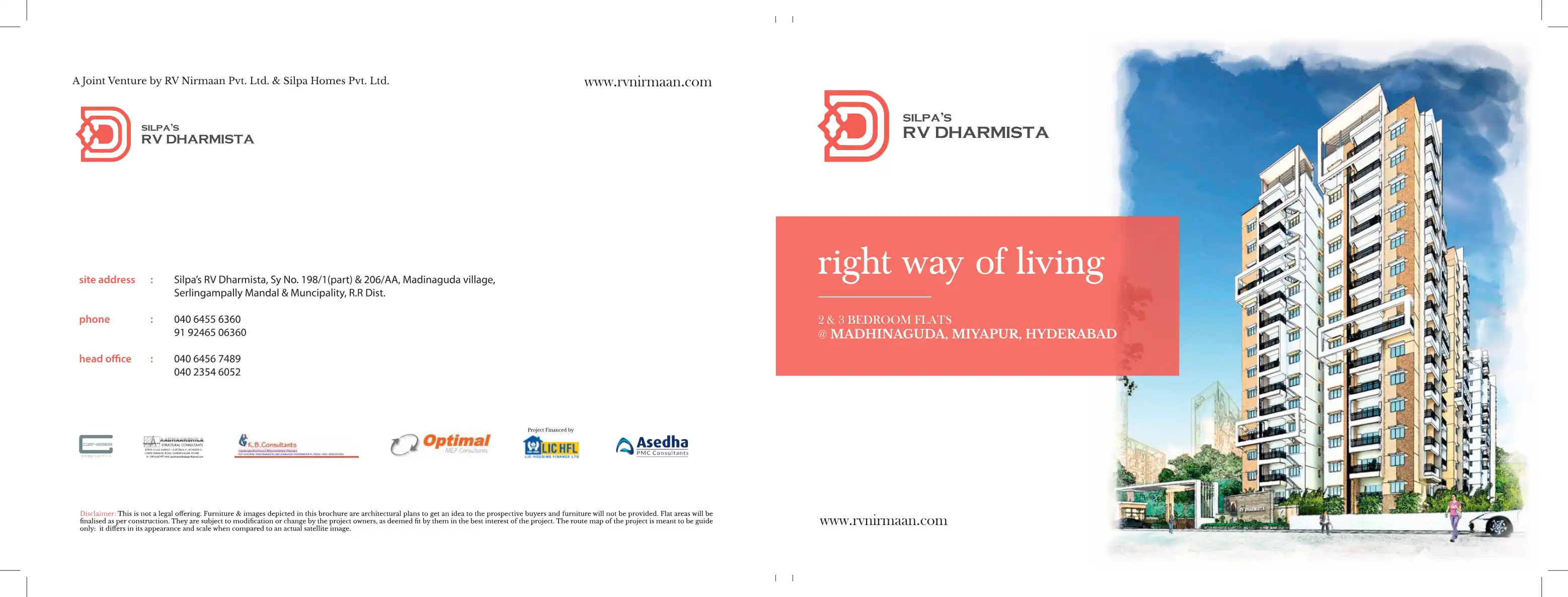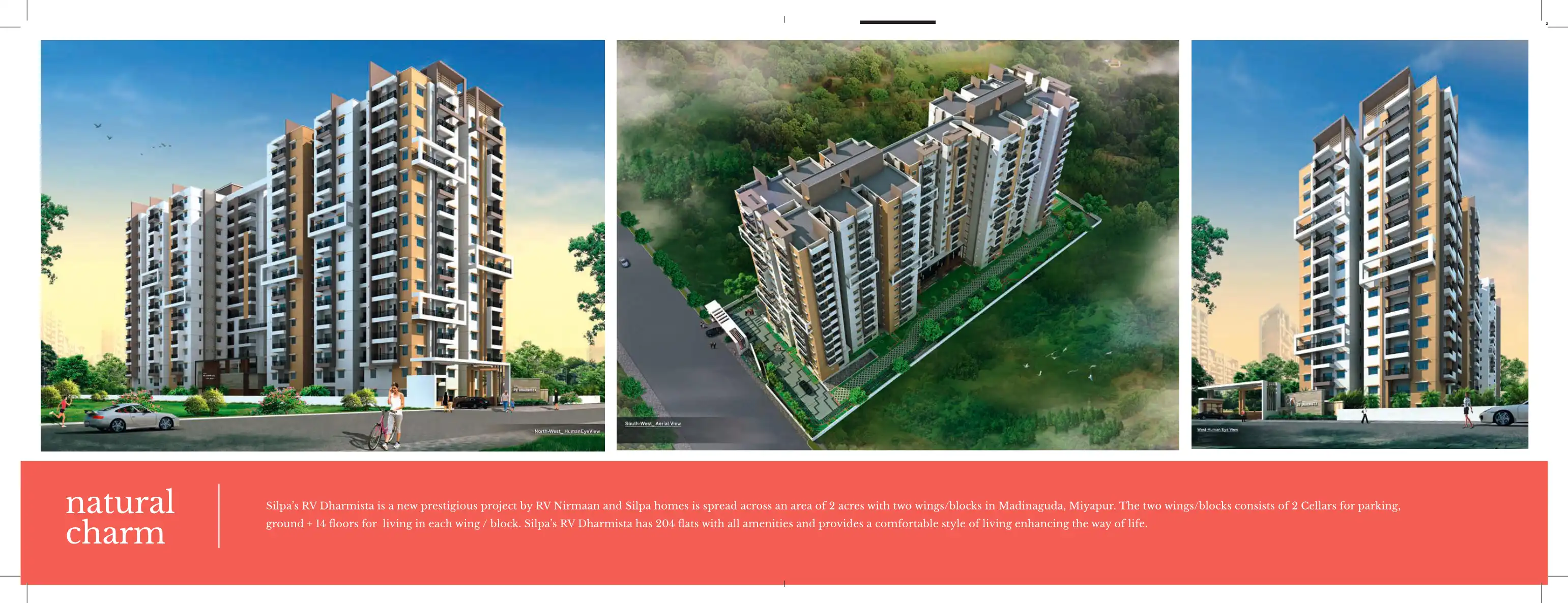 Silpa's RV Dharmista is a new prestigious project by RV Nirmaan and Silpa homes is spread across an area of 2 acres with two wings/blocks in Madinaguda, Miyapur. The two wings/blocks consists of 2 Cellars for parking, ground + 14 floors for living in...