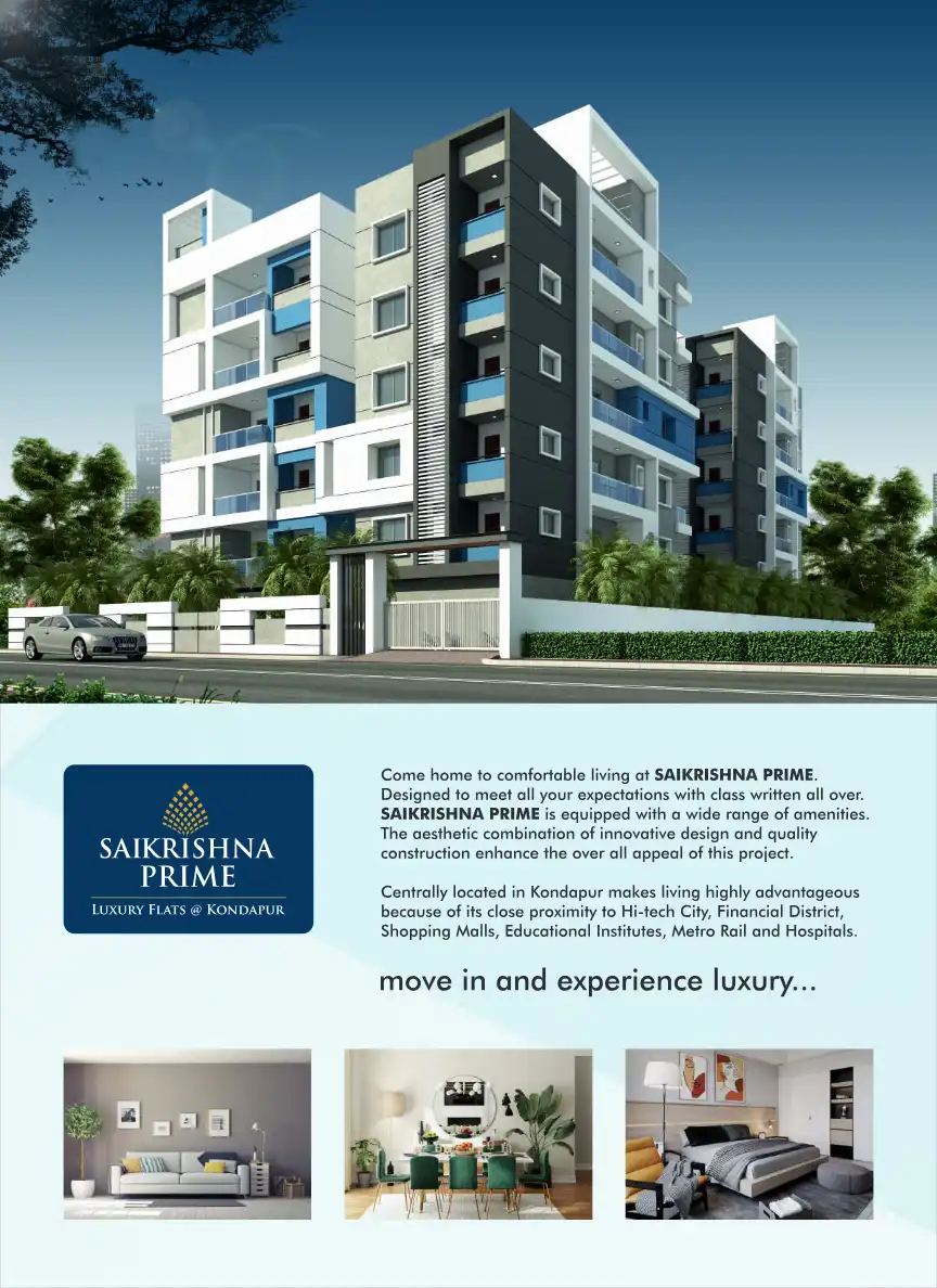 SAIKRISHNA PRIME is equipped with a wide range of amenities. The aesthetic combination of innovative design and quality construction enhance the over all appeal of this project.