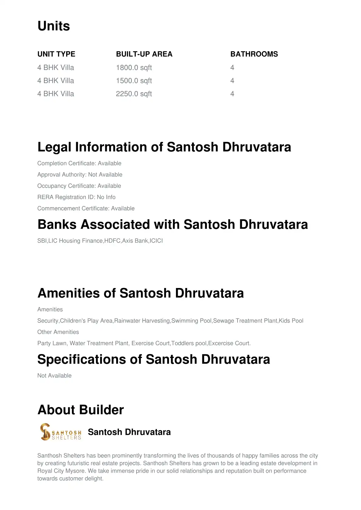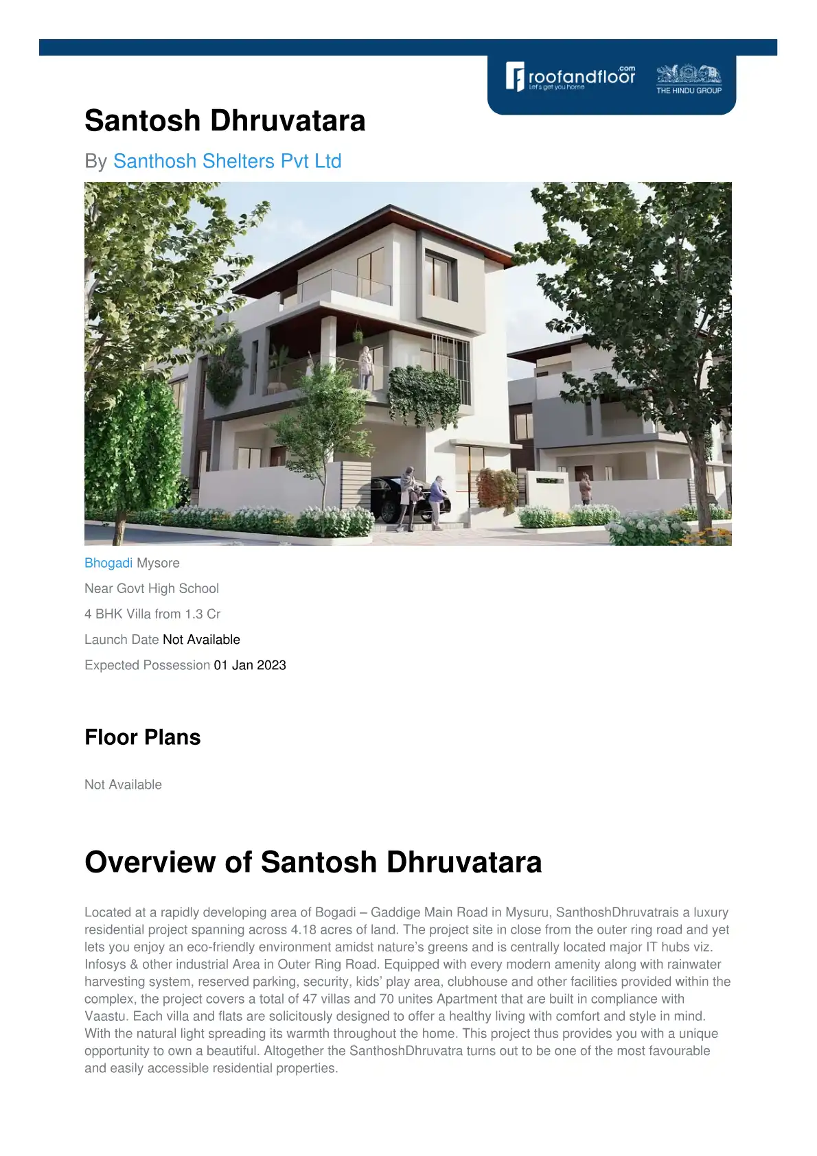 Located at a rapidly developing area of Bogadi - Gaddige Main Road in Mysuru, SanthoshDhruvatrais a luxury residential project spanning across 4.18 acres of land. The project site in close from the outer ring road and yet lets you enjoy an eco-friend...