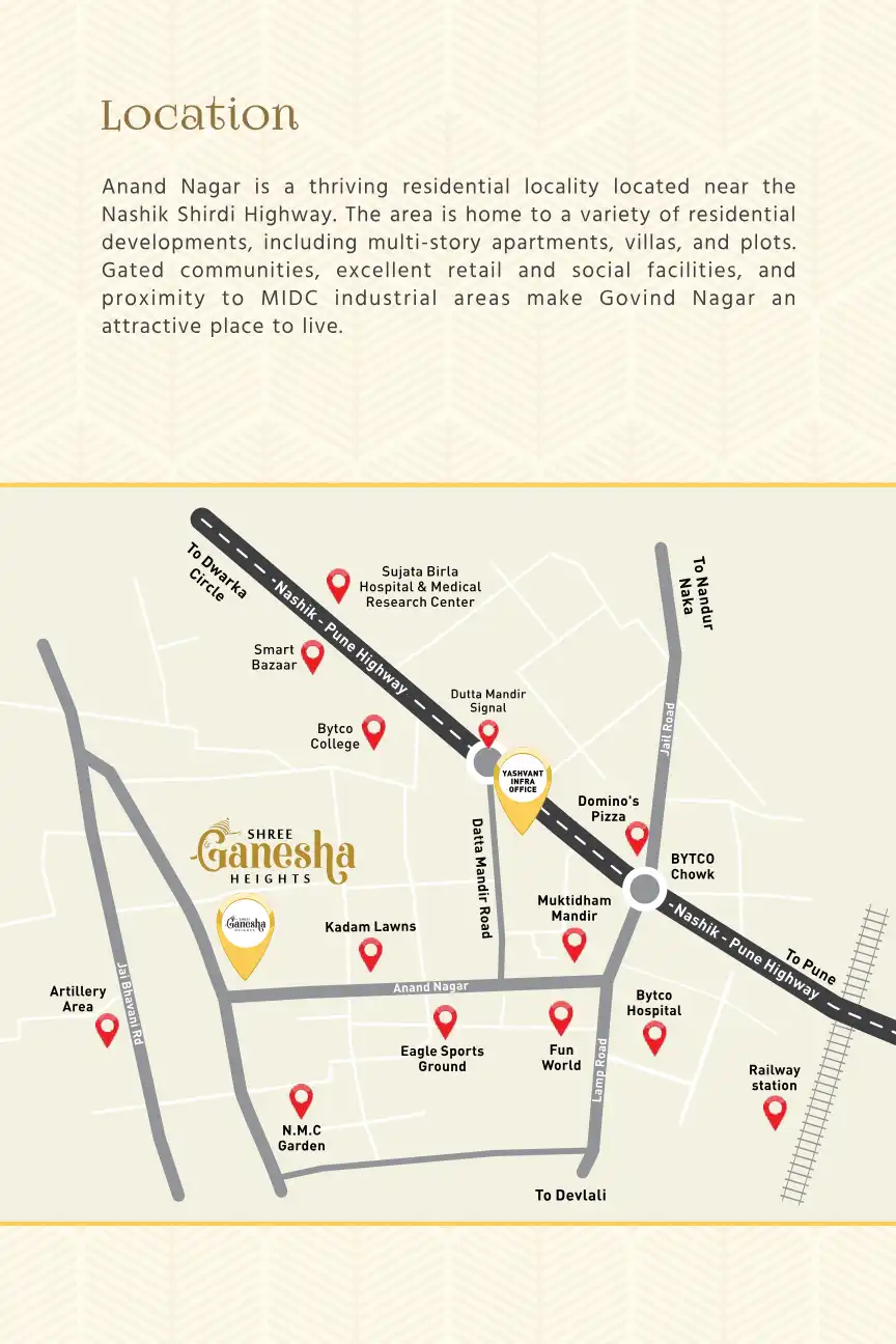 Shree Ganesha Heights is a luxurious residential project located in one of the most developed areas of Nashik, Anand Nagar.The project offers 1 and 2 BHK flats with special amenities designed to bring joy and comfort to every family member.