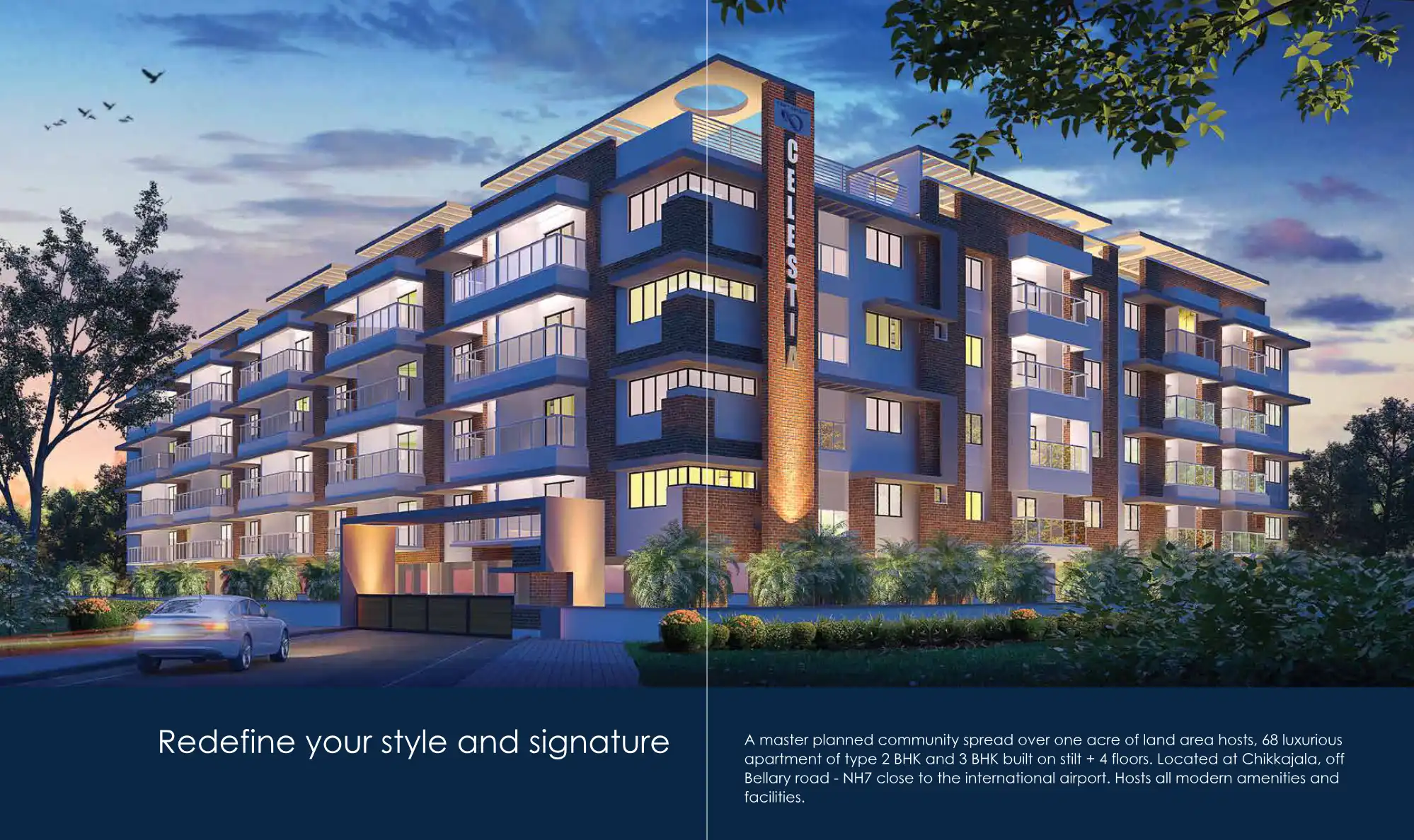 A master planned community spread over one acre of land area hosts, 68 luxurious apartment of type 2 BHK and 3 BHK built on stilt + 4 floors. Located at Chikkajala, off Bellary road - NH7 close to the international airport. Hosts all modern amenities...