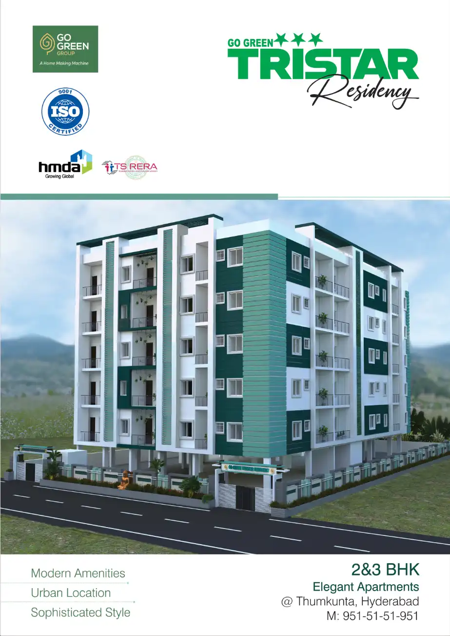 GO GREEN TRISTAR RESIDENCY 2&3 BHK Apartments in Thumkunta, Hyderabad is a well planned society, it is well made and has all the amenities you need. You get ample & dedicated parking space for car and bike. You won't have to only look for houses on t...