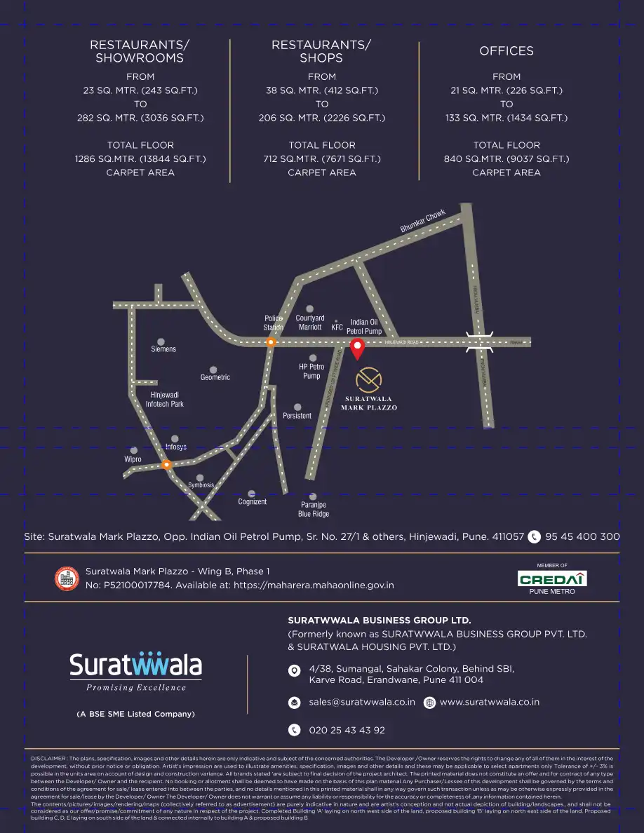 Suratwala Mark Plazzo is a high rise, modern, commercial superstructure. Owing to its strategic location right on the main road leading to the Rajiv Gandhi IT Park, it is connected to all the necessities and luxuries of life 24x7.