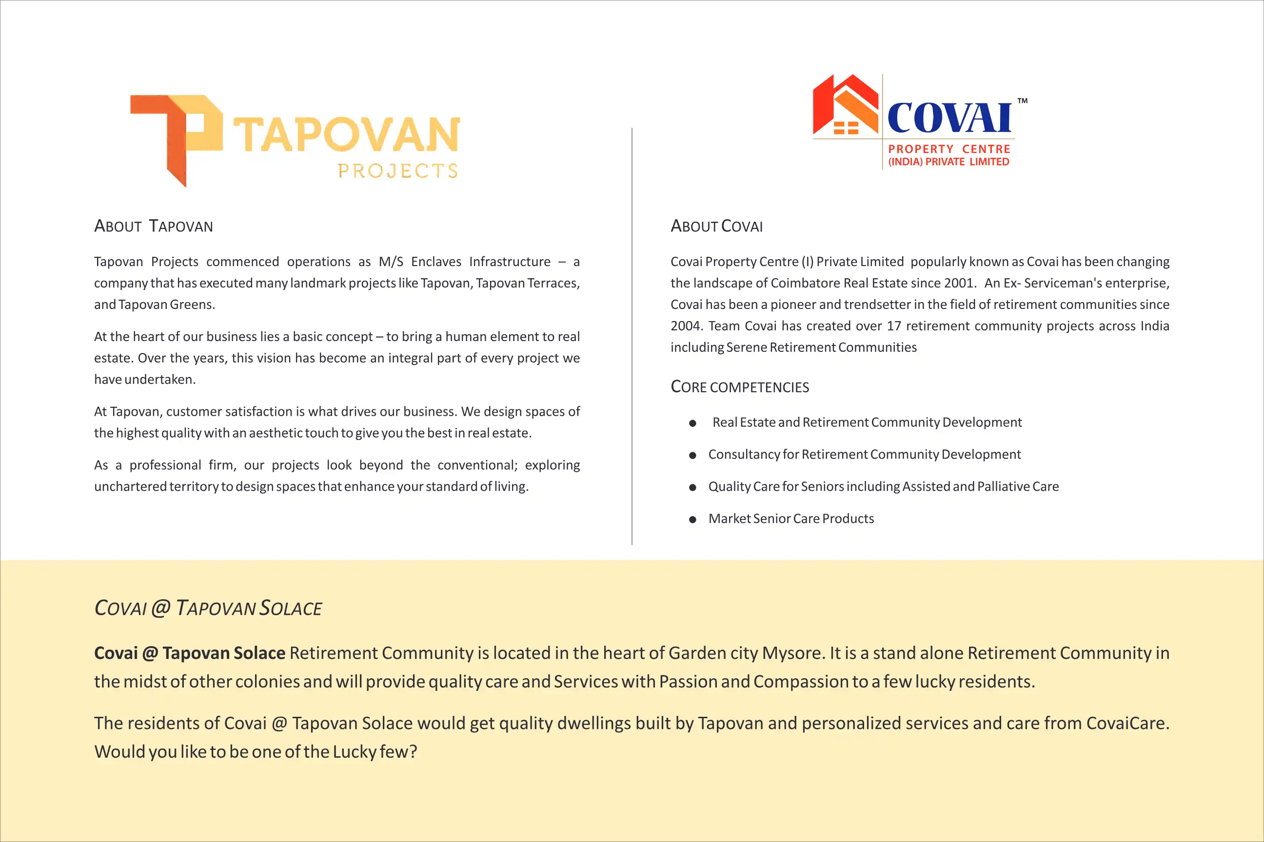 Covai @ Tapovan Solace Retirement Community is located in the heart of Garden city Mysore. It is a stand alone Retirement Community in the midst of other colonies and will provide quality care and Services with Passion and Compassion to a few lucky r...